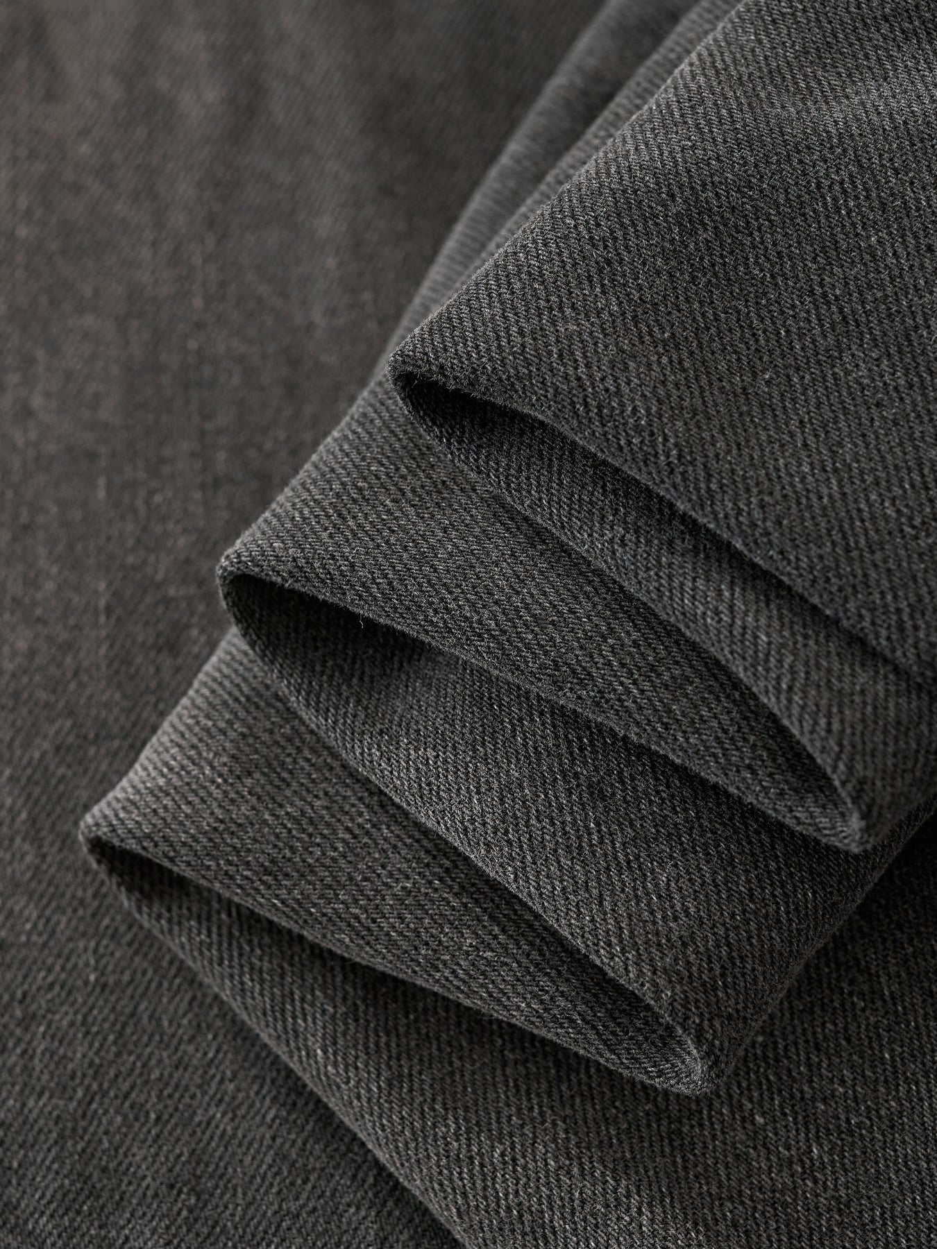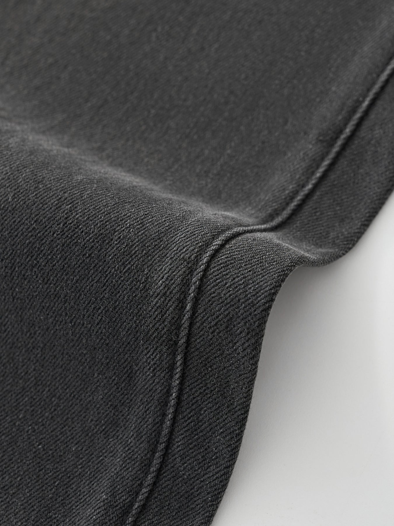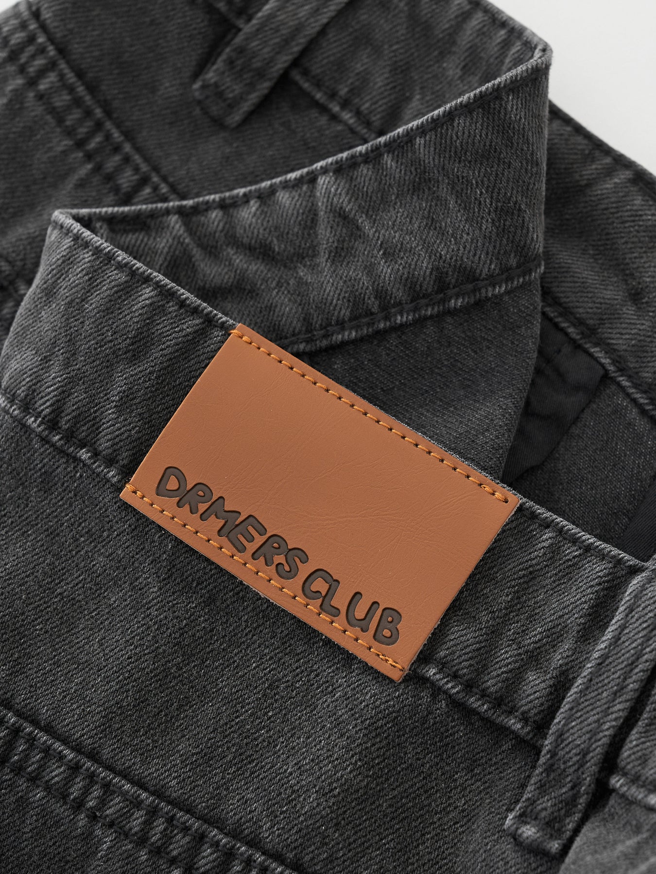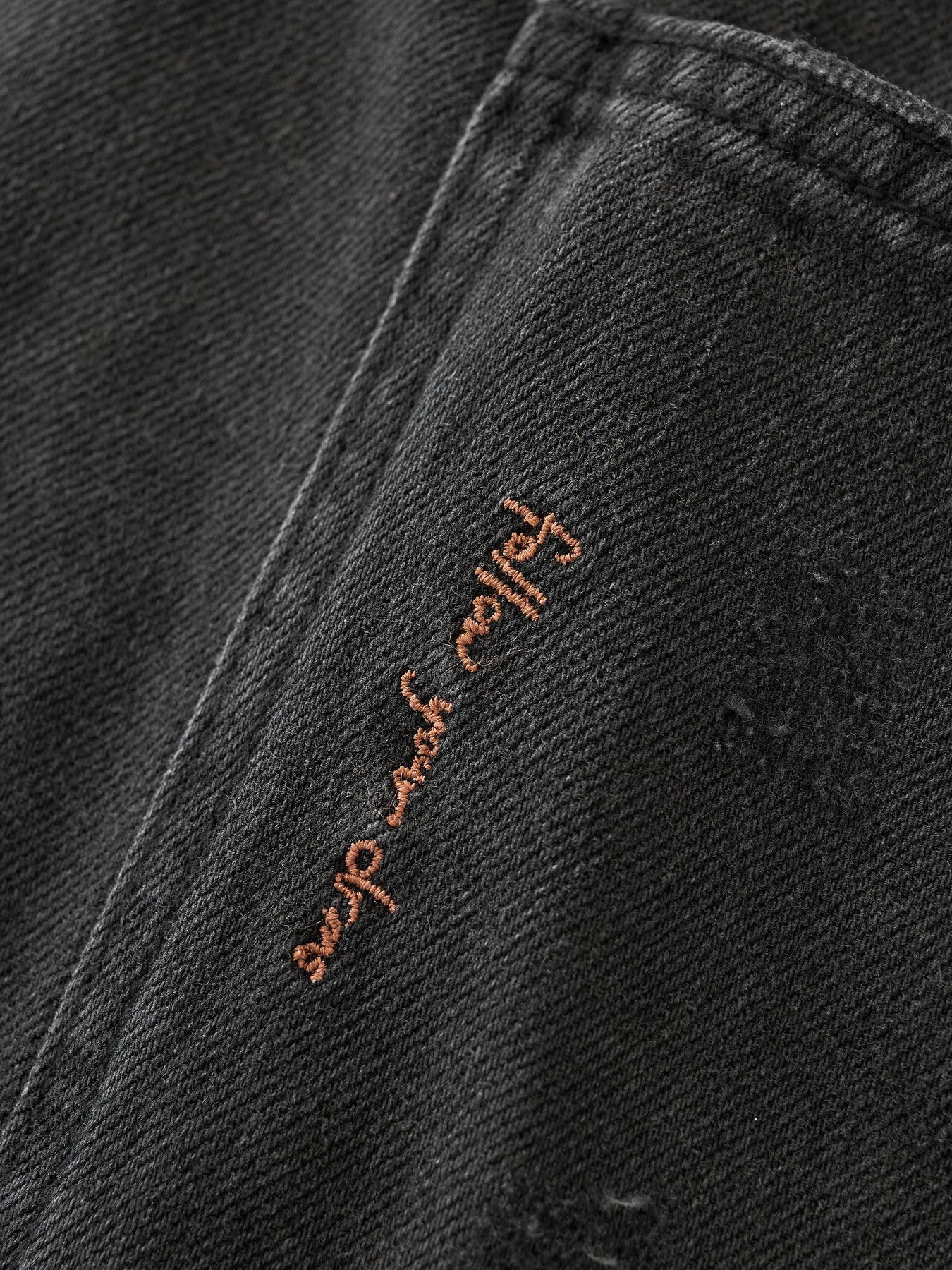 Embroidered text "follow your drms" on back pocket with contrast stitching